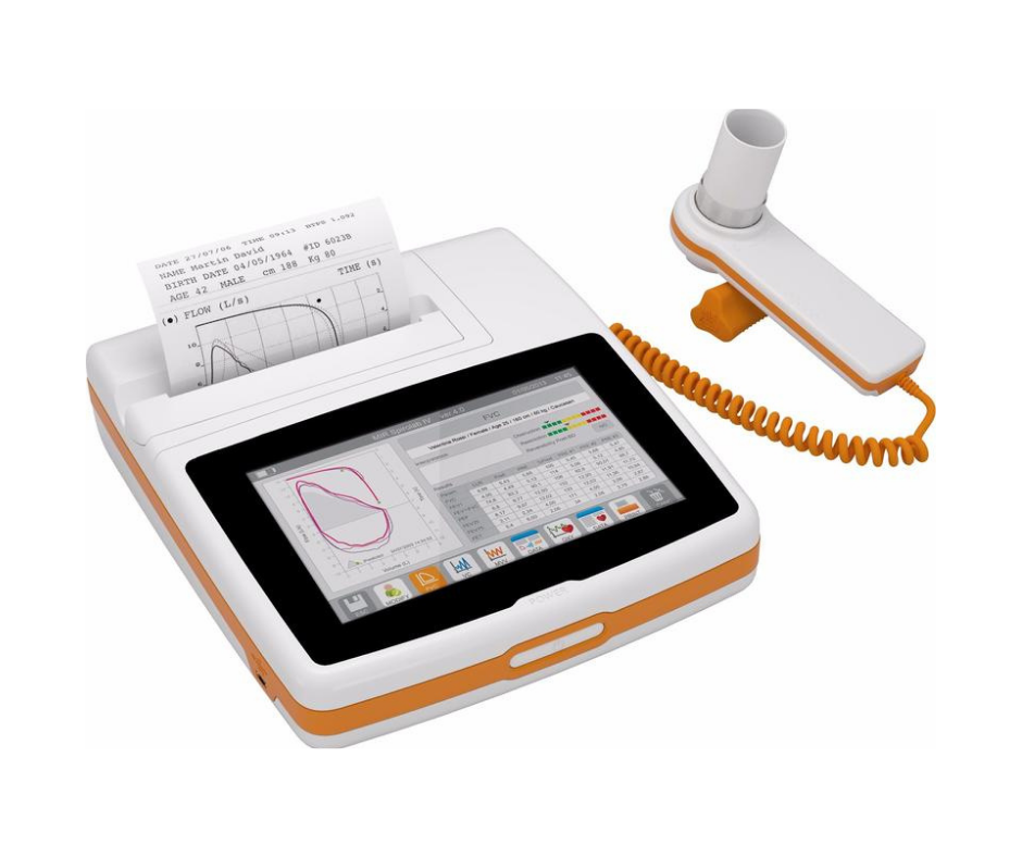 Espirómetro marca MIR modelo SPIROLAB con pantalla a color táctil e impresora incorporada. Incluye Bluetooth, Turbina reusable de larga vida y Programa WinSpiro Pro, para análisis opcional de resultados en una PC. Se entrega con maleta porta equipo, 1 click de nariz, 2 boquillas y CD con programas y manuales.